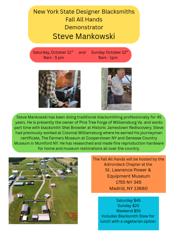 Steve Mankowski started blacksmithing in the summer of 1981 with Jeff Jubenville at the Genesee Country Museum in Mumford, NY and worked with Paul Spaulding at the Farmer’s Museum in Cooperstown, NY, from 1986 to 1988. Later, he earned his blacksmith journeyman papers at the Colonial Williamsburg Foundation under Peter Ross in 1994.