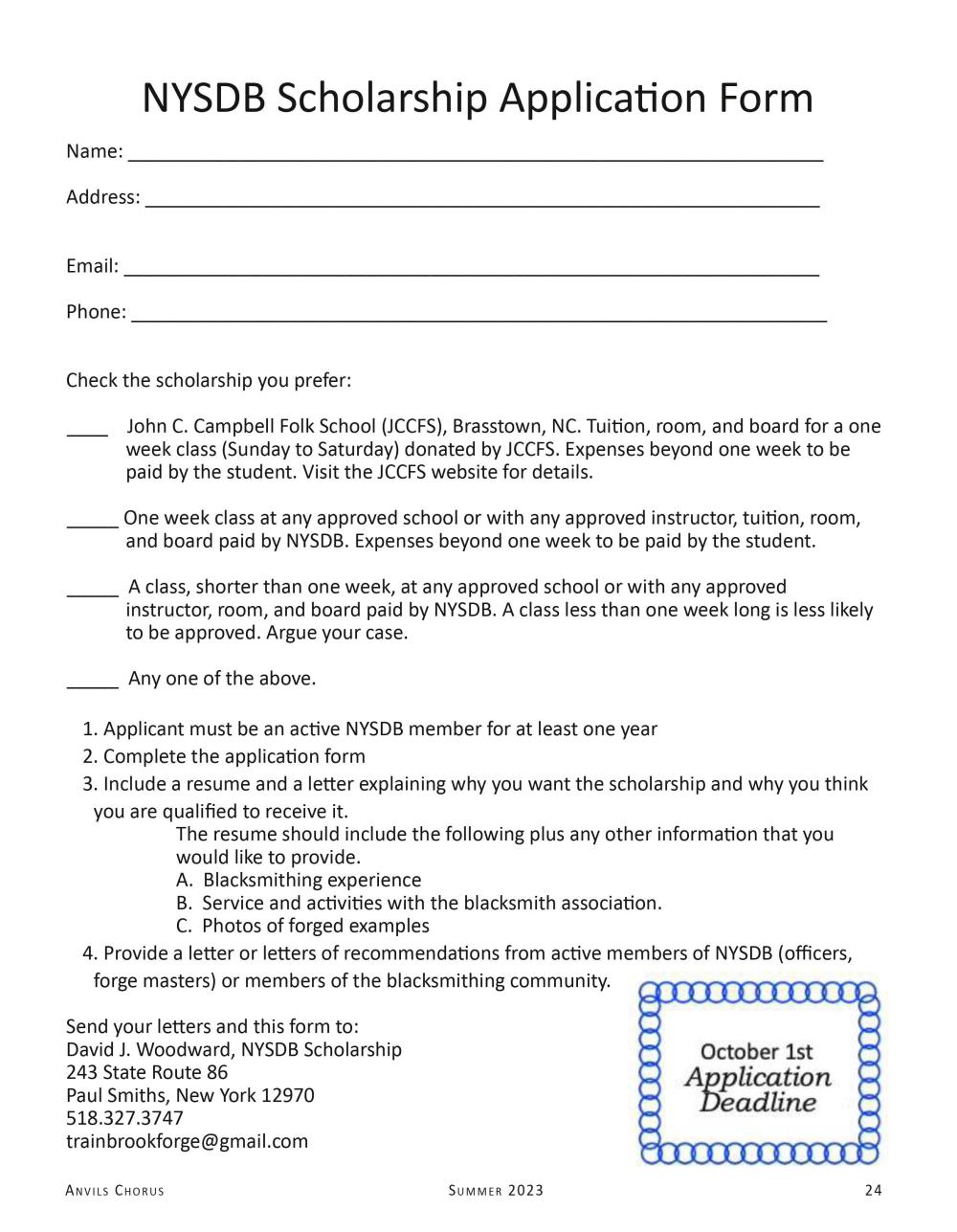 Invest in the education and development of our members through our scholarship program. This program covers the tuition, room and board expenses to allow the recipient to attend a week long class at the blacksmithing school of their choice.